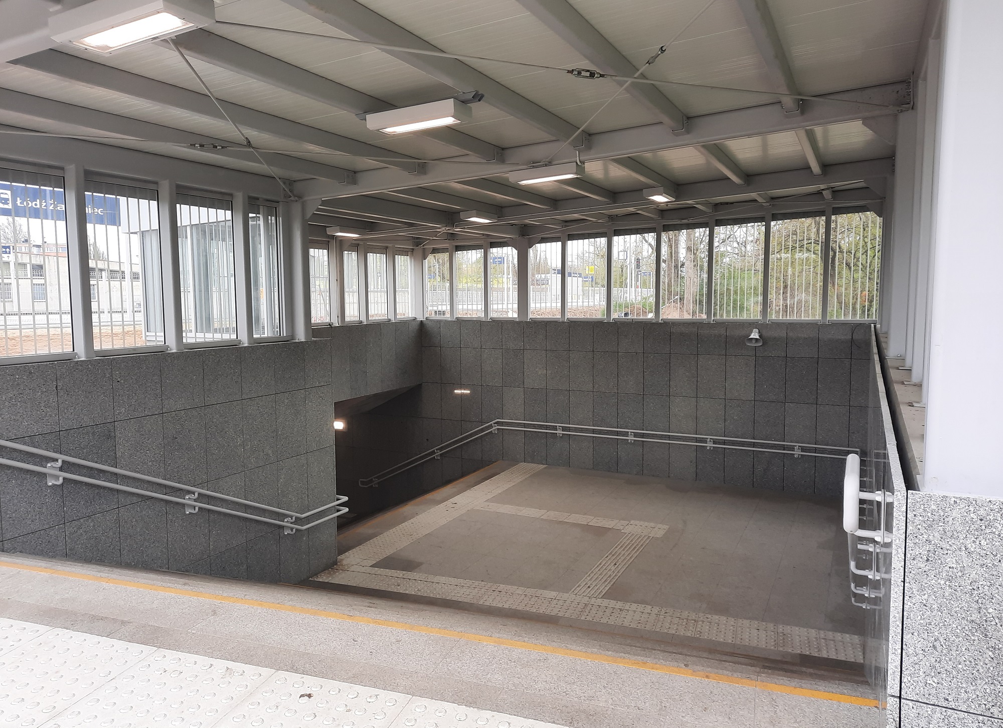 PLK-2021-07-14-W-Zgierzu-i-Lodzi-Zabiencu-podrozni-korzystaja-z-nowych-peronow-i-przejsc-podziemnych-z-windami-Stacja-Lodz-Zabieniec-zadaszone-wejscie-po-schodach-do-odnowionego-przejscia-podziemnego-fot.jpeg