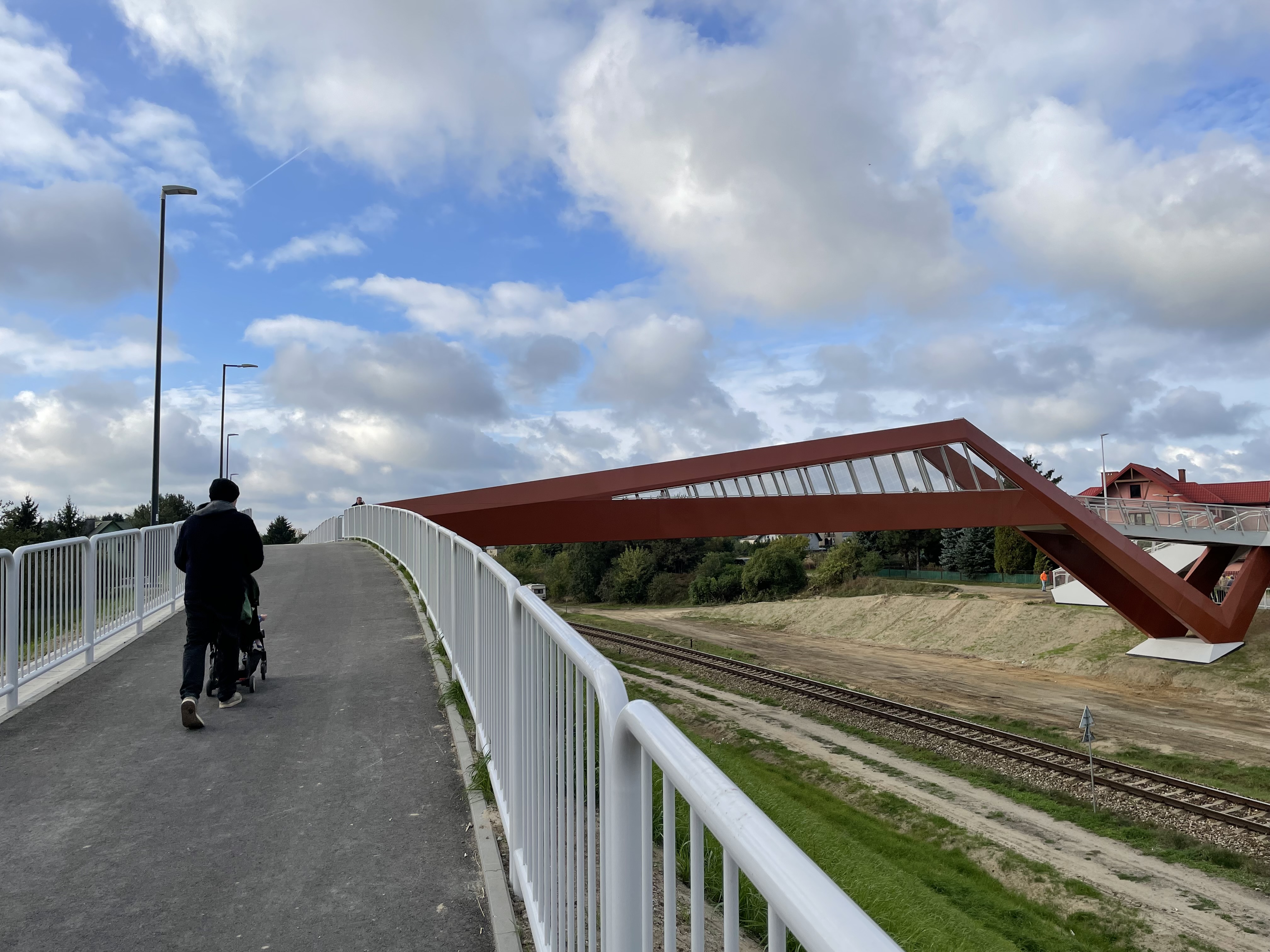PLK-2023-10-06-Nowe-bezpieczne-przejscie-nad-torem-w-Lubartowie-Pieszy-z-wozkiem-wchodzi-po-pochylni-kladki-nad-torem-w-Lubartowie-fot.jpg
