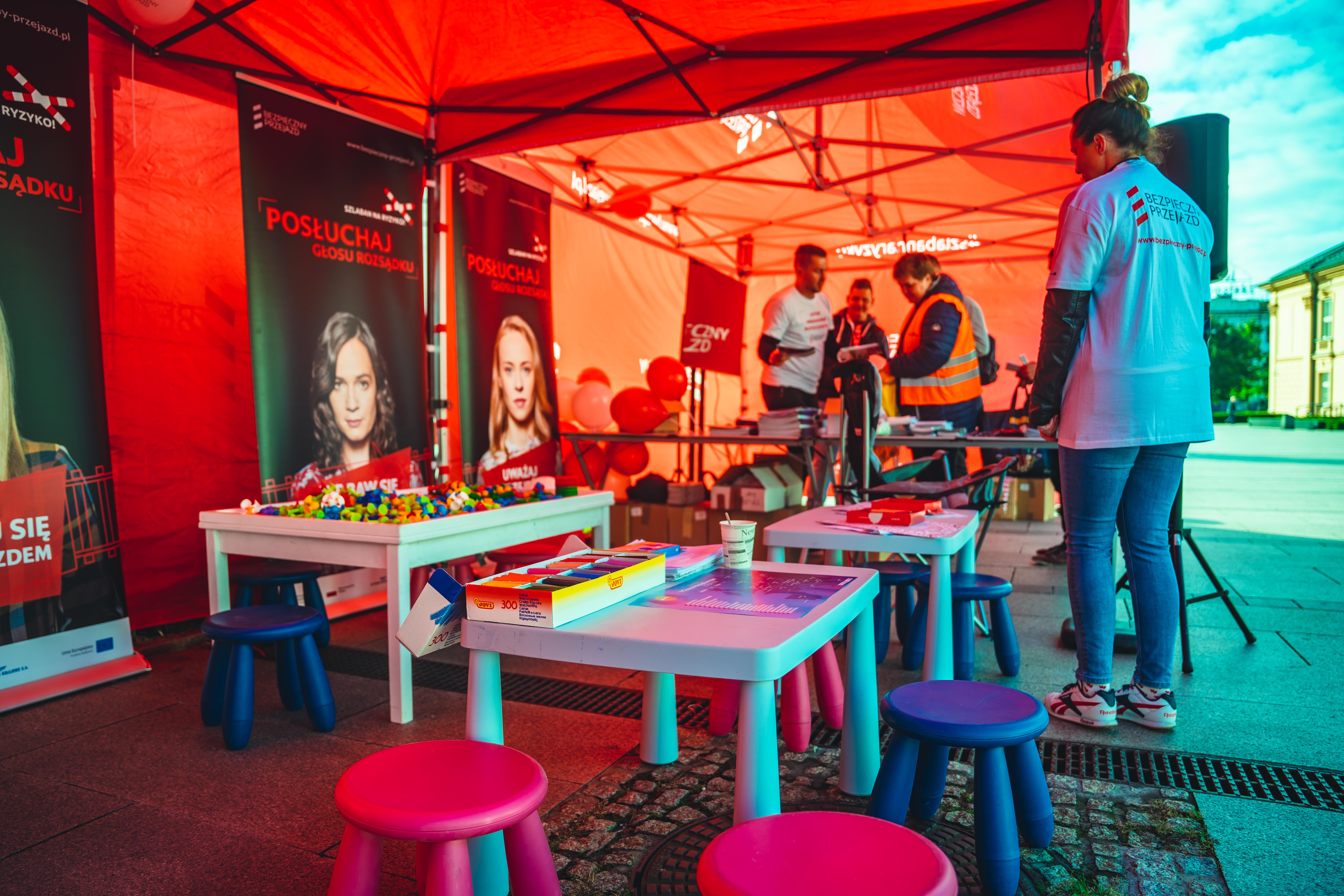 Stoisko kampanii społecznej "Bezpieczny Przejazd" w trakcie przejazdu pociągu europejskiego (Connecting Europe Express) na stacji Kraków Główny.